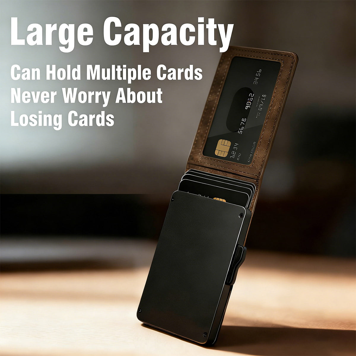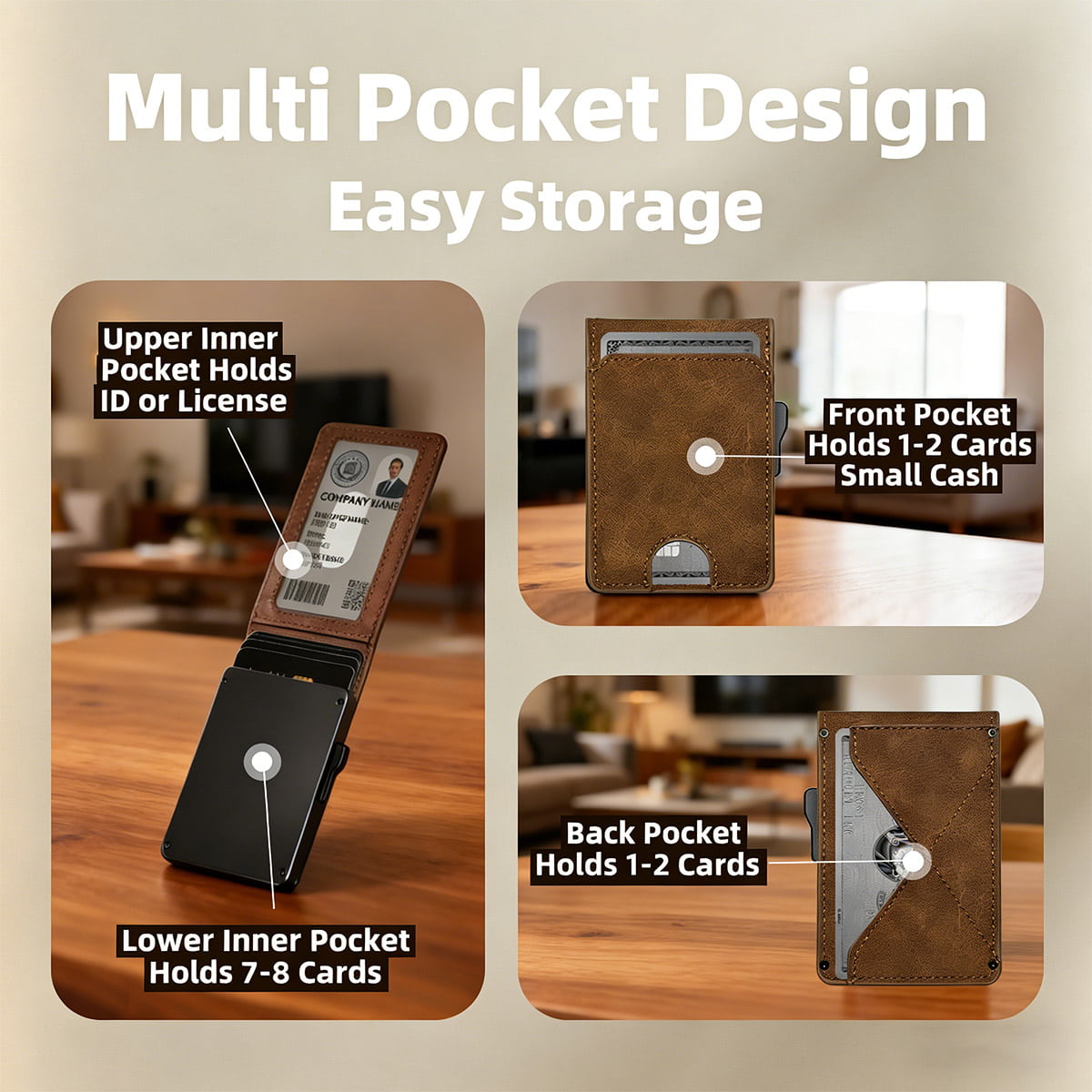 Multi-pocket layout includes upper and lower inner pockets, front and back pockets, and an ID window, capable of holding 7-8 cards + 1-2 frequently used cards + a small amount of cash to meet daily storage needs.